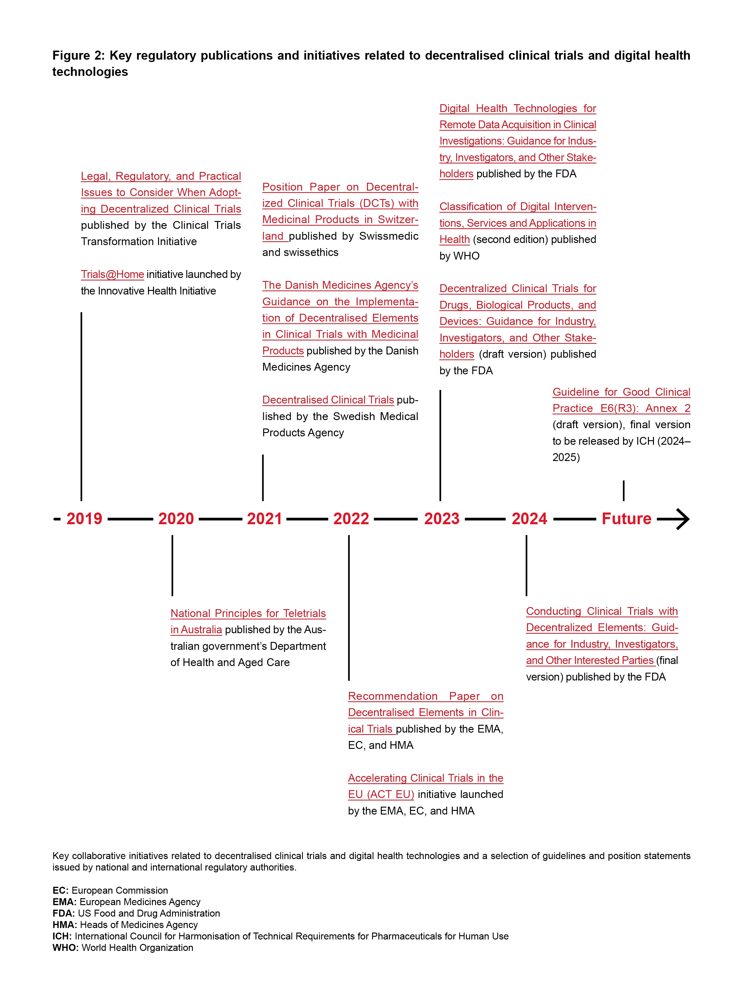 - Clinical Trials Transformation Initiative (n.d.) Recommendations to sponsors for planning decentralized trials. Accessed 23 October 2024: https://ctti-clinicaltrials.org/wp-content/uploads/2022/04/CTTI-Digital-Health-Trials-Planning-Decentralized-Trials-Recs.pdf